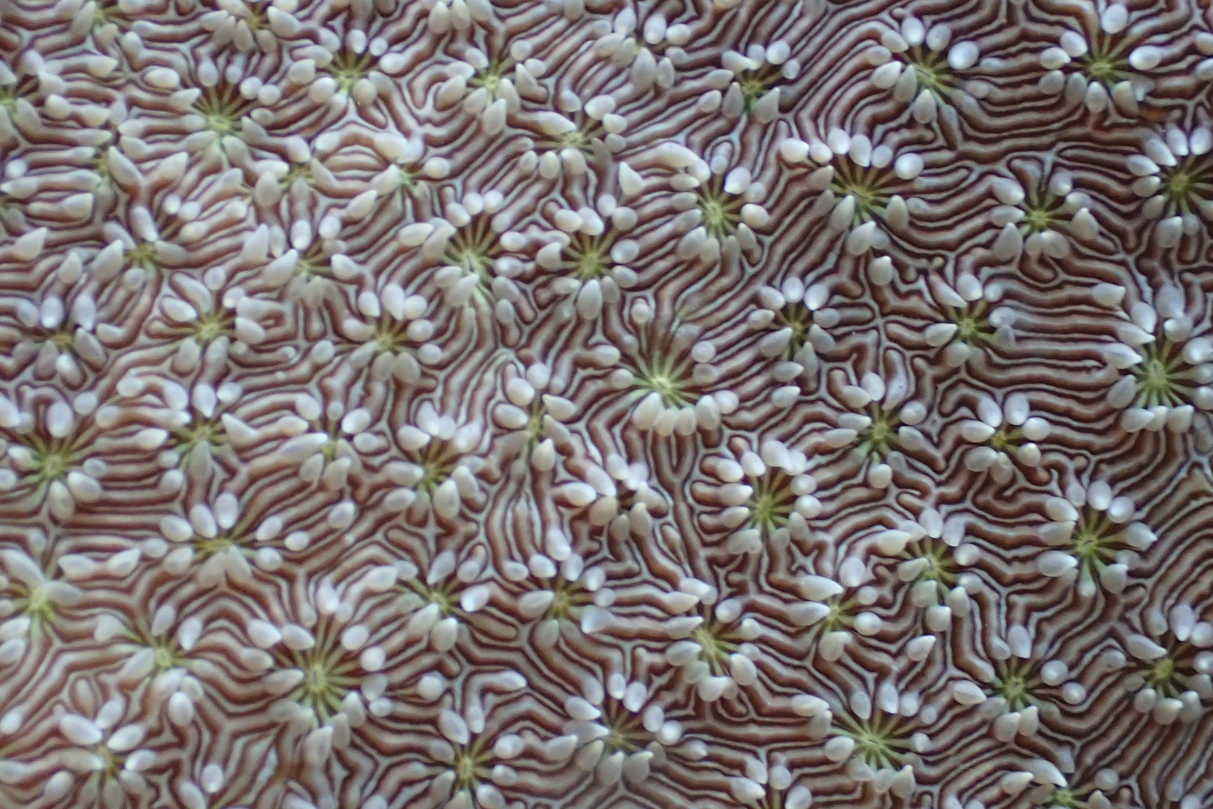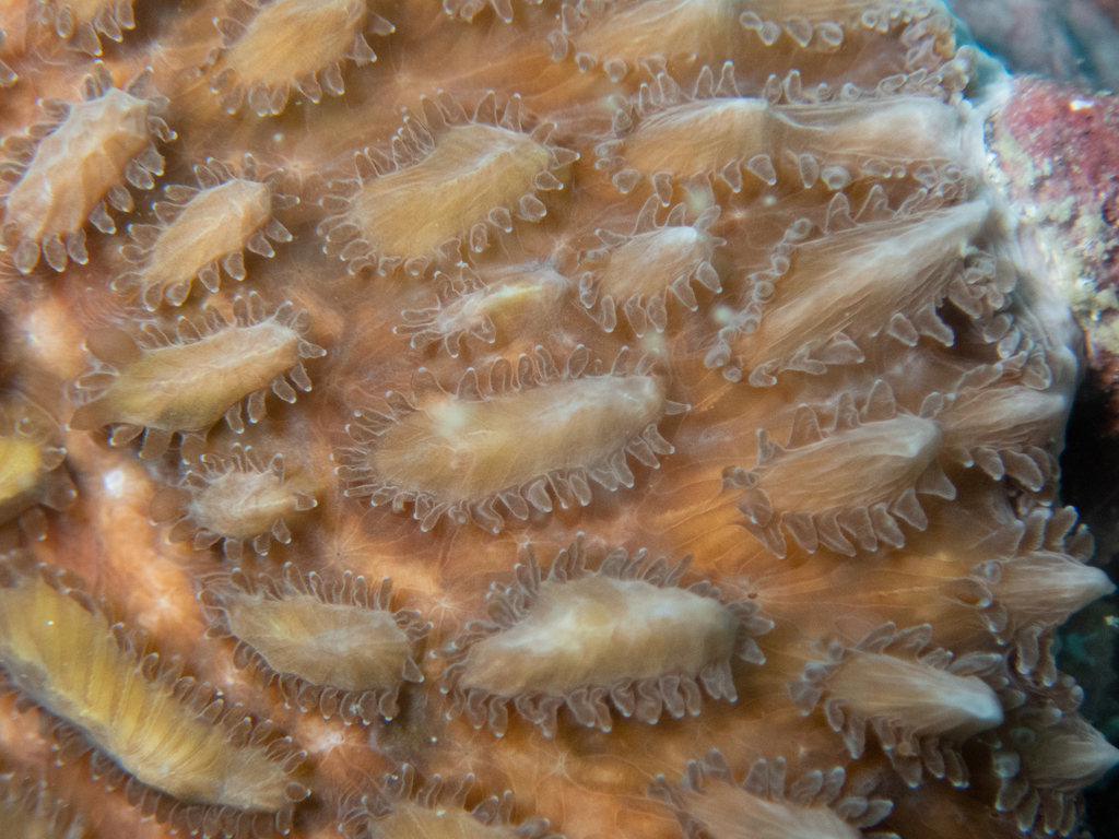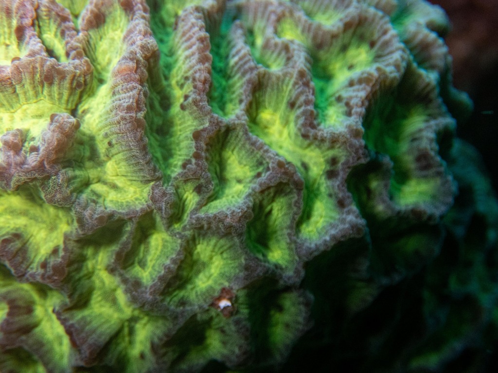 Meandroid - A colony of polyps that are arranged in valleys between meandering ridges with shared walls. |