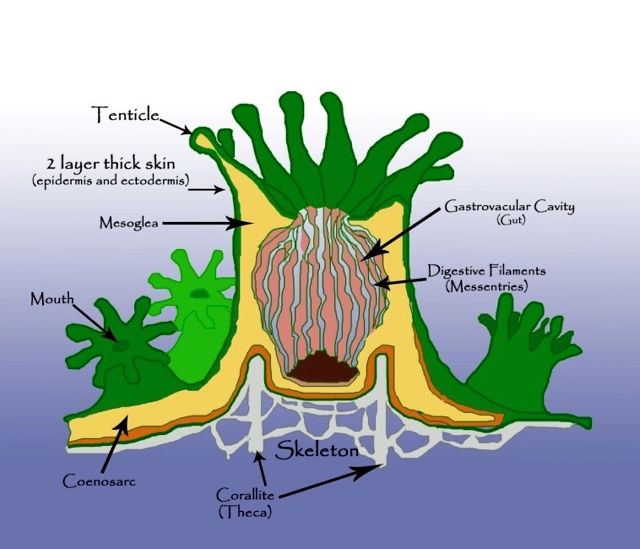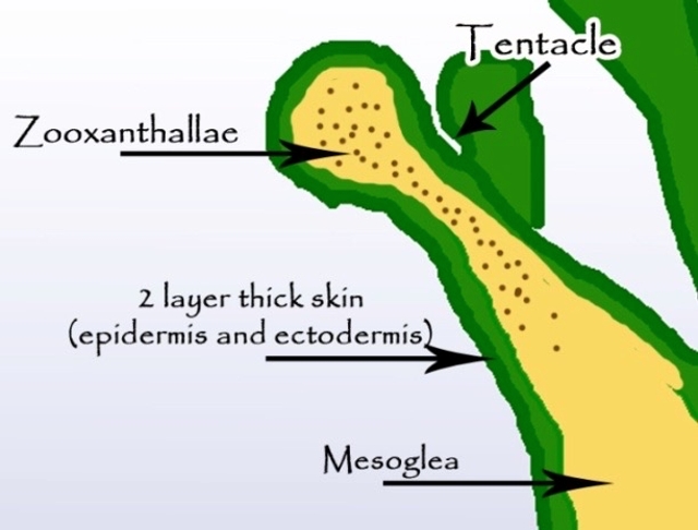 Mesoglea - A gelatinous layer located between the outer tissue layer (epidermis) and the inner tissue later (gastrodermis), provides structural support and elasticity to the polyp.